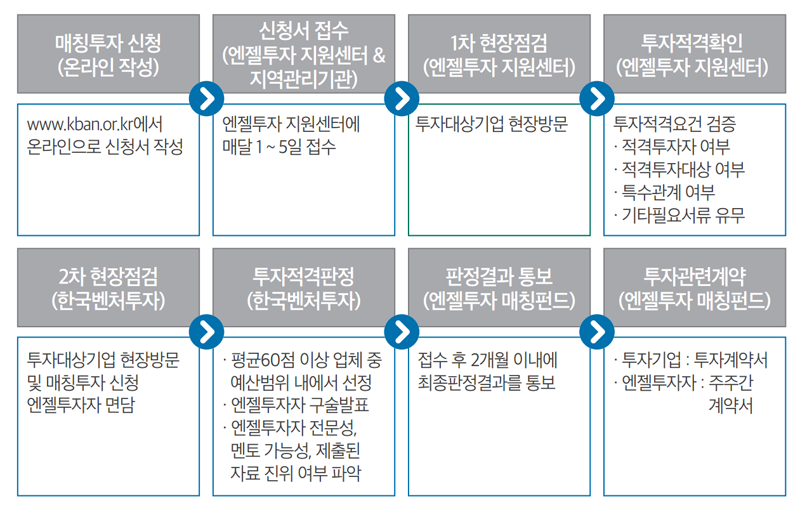 엔젤투자자 육성을 통한 창업 활성화 기반 구축을 위해 일정조건(투자실적, 교육이수, 개인투자조합 등)을 갖춘 엔젤투자자가 지분투자 시 엔젤투자자와 해당 기업에 대해 평가 및 특이사항 검토를 통해 매칭하여 투자하는 정부 펀드이다.
