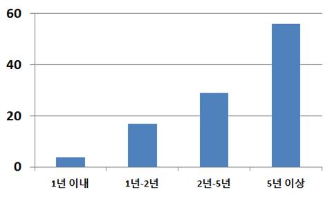 엔젤투자를 5년 이상 장기적으로 경험한 엔젤투자자는 50%이상으로 많은 비중을 차지하고 있으나, 최근 1-2년 내에 엔젤투자시장에 진입한 엔젤투자자의 비중은 20%에 그쳤다.